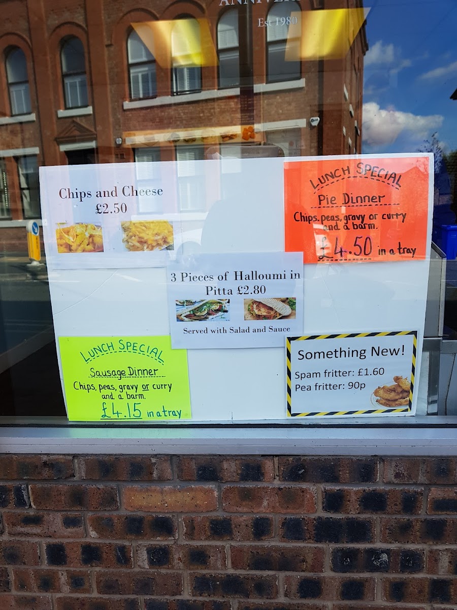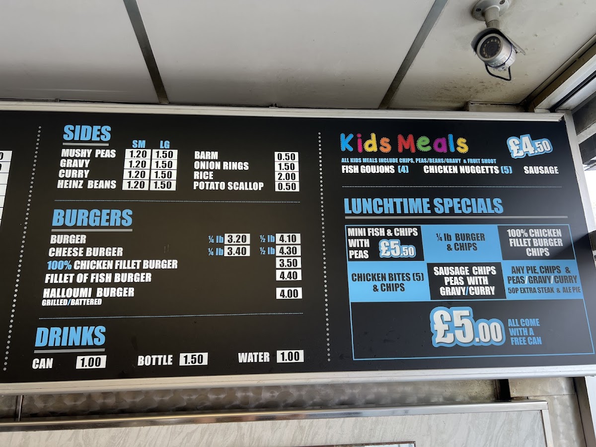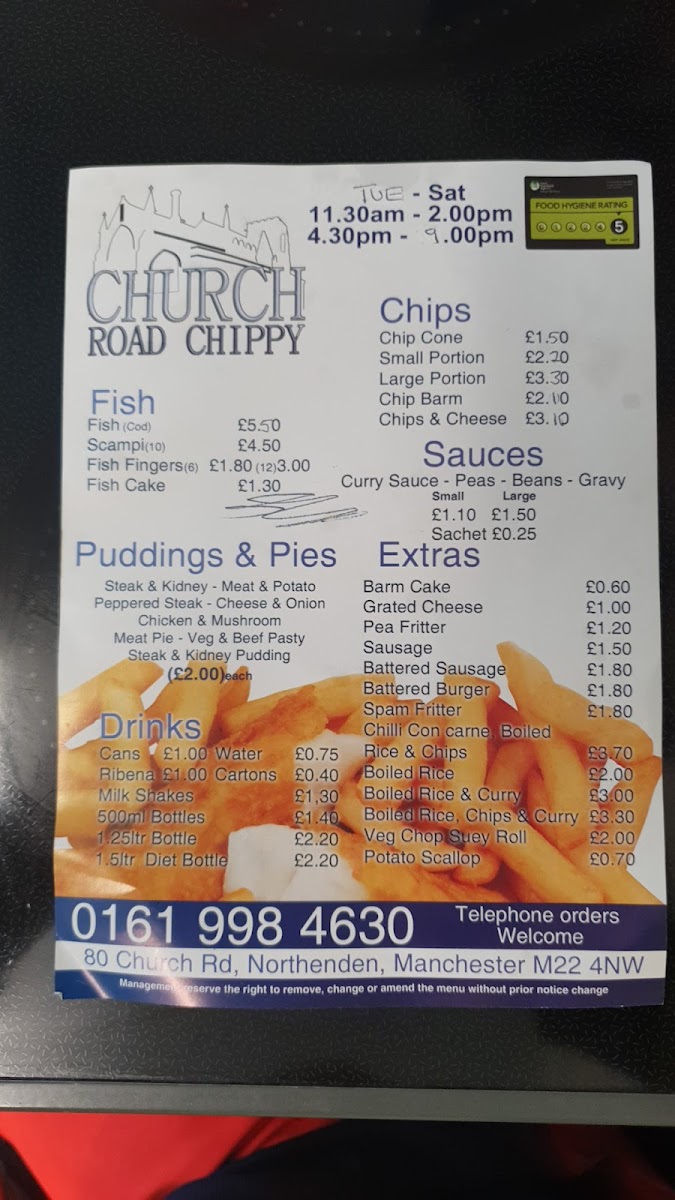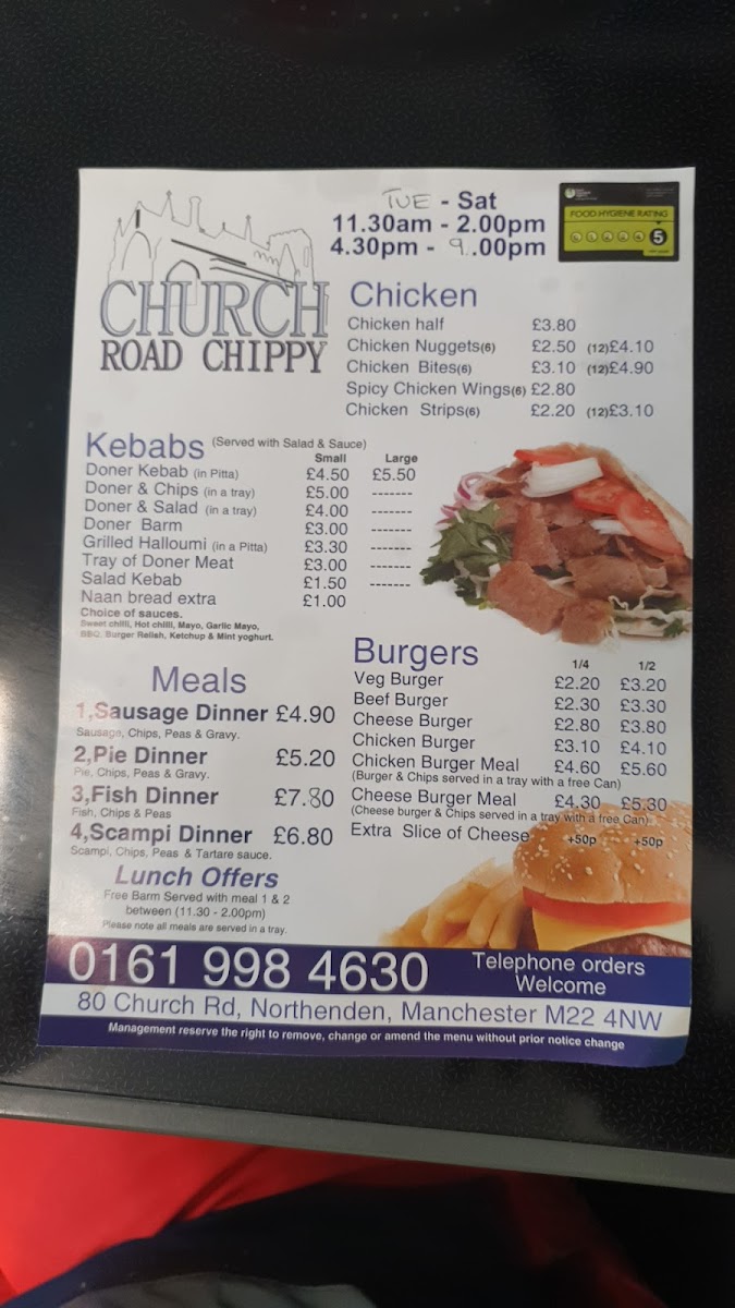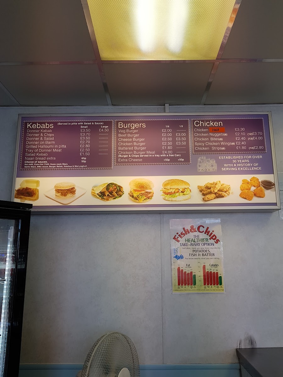 From a reviewer’s perspective, the menu at Church Road Chippy offers a classic and satisfying selection of traditional takeaway favourites at reasonable prices, with something to suit most tastes. The Lunch Special: Sausage Dinner is a convenient and filling option, while the kebab section includes popular choices like Donner Kebab, Donner & Chips, Donner & Salad, Donner On Barm, and Grilled Halloumi In Pitta, providing a good mix of meat and vegetarian options. Burger lovers can choose from the Veg Burger, Beef Burger, Cheese Burger, Chicken Burger, and Battered Burger, while the chicken menu features items such as Chicken Half, Chicken Nuggets, Chicken Bites, Spicy Chicken Wings, and Chicken Strips. Traditional fish shop staples are well represented with Fish, Scampi, Fish Fingers, and Fish Cake, and the savoury pies and puddings like Steak & Kidney, Peppered Steak, Meat Pie, and Steak & Kidney Pudding add to the hearty feel of the menu. Sides such as Chip Cone, Chip Barm, and Chips & Cheese, along with sauces like Curry Sauce, Peas, Beans, and Gravy, complement the main dishes well. Extras including Barm Cake, Grated Cheese, Pea Fritter, Sausage, and Battered Sausage, plus drinks like Cans, Water, Ribena, and Cartons, round out a menu that is simple, traditional, and clearly focused on classic British chippy favourites.